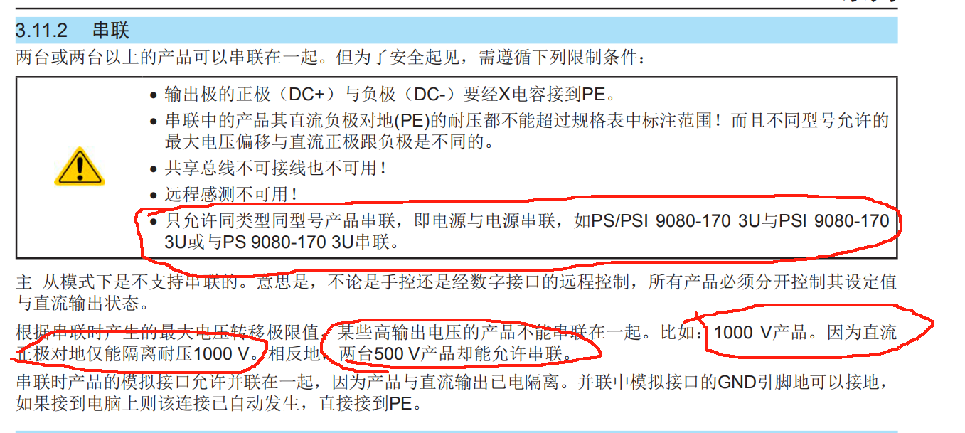 近日,我公司的合作好伙伴合肥天時測控技術有限公司的徐經理咨詢一個德國EA直流電源能否串聯的問題??蛻籼岢?,以PSI 9500-60 3U的電源為例,能否串聯以便獲得大于500V的輸出電壓?