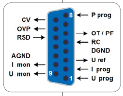 要監控輸出電壓與電流,可給模擬輸出腳接上0 V...10 V或0 V...5 V電壓完成。此外,還有幾個輸入腳和輸出腳,可用來控制和監控產品狀態。