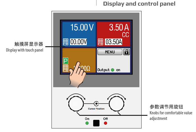 設(shè)定與實(shí)際輸出電壓、電流與功率都清晰顯示于圖形顯示器上。彩色的TFT屏幕為點(diǎn)觸式,用一個(gè)手指 就能控制所有功能。